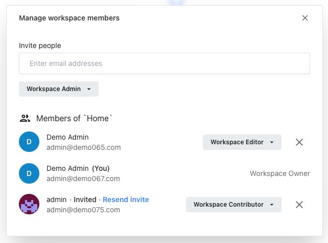 View and mange members and invites: You can view all current members and pending invites. Click X button remove member from workspace or cancel invite. You can also change existing member role or resend an invite.
