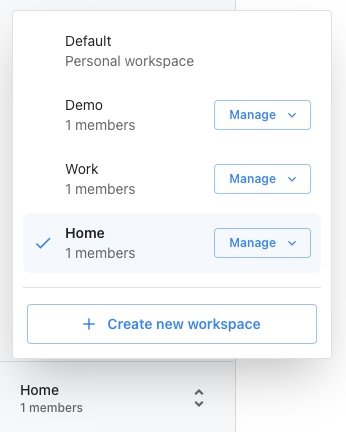 Click on the Manage button next to workspace name in the selector to open workspace management dialog, here you can: